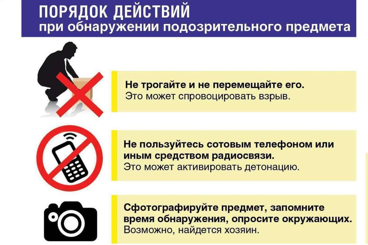 • Категорически запрещается трогать, вскрывать, передвигать или предпринимать какие-либо иные действия с обнаруженным предметом.